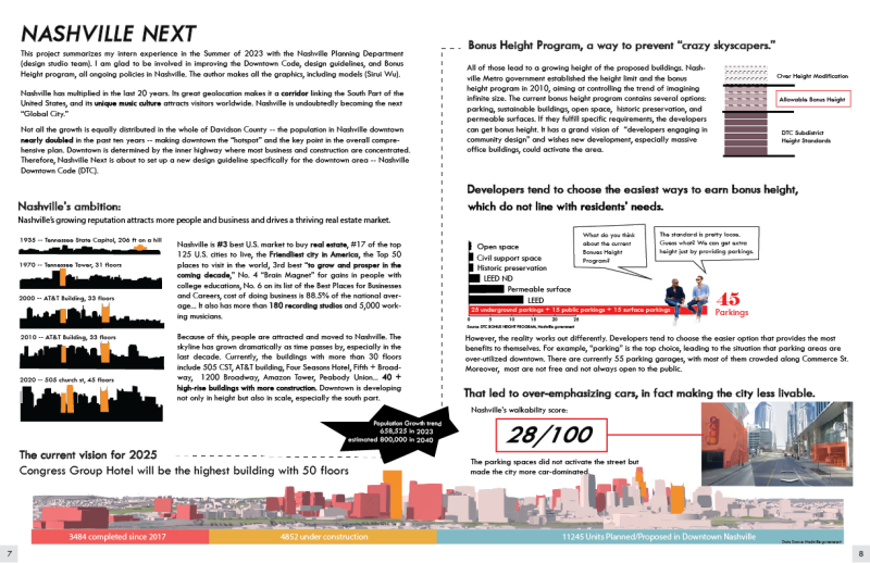 The Nashville Next project critically examines rapid urban growth in Nashville and its impact on livability, equity, and urban form. Driven by strong economic expansion and population increase, downtown Nashville has experienced a surge in high-rise development, often incentivized by the bonus height program. However, this system has led developers to prioritize easily attainable incentives—such as parking provisions—over community-oriented benefits like open space, affordable housing, or cultural preservation.