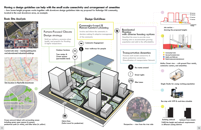 To address these challenges, the project proposes a revised bonus height framework that removes parking incentives and emphasizes diversified land use, human-centered design, and community engagement. Key strategies include promoting mixed-income residential development, enhancing public transportation and walkability, and integrating green infrastructure to improve climate resilience. By linking zoning incentives with meaningful public benefits—such as resilient public spaces, neighborhood support facilities, and sustainable building practices—the proposal aims to realign development with residents’ needs. The design application at a downtown site demonstrates how these guidelines can foster connectivity, activate public space, and create a more inclusive and livable urban environment.